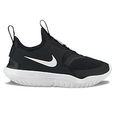 The nike preschool kids flex runner shoes have leather sides with elastic straps and foam soles.